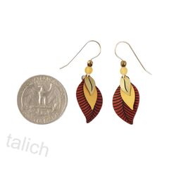 3 part leaves earrings in rust and brass, the topmost leaf is etched lacquered brass, accented with matching beads. Lightweight and comfortable. Rich warm earth tone. Great for everyday wear.