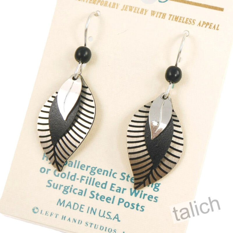 3 part layered leaves Adajio earrings in hand painted black, shiny silver and brushed nickle tones, accented with matching beads, each layer is a different leaf. Lightweight and comfortable. Great for everyday wear.
