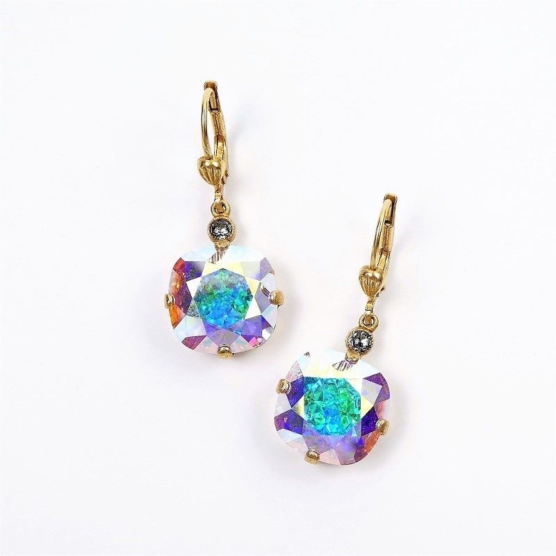 - 14K gold antiqued plating over brass/12mm Swarovski crystals in AB Crystal.