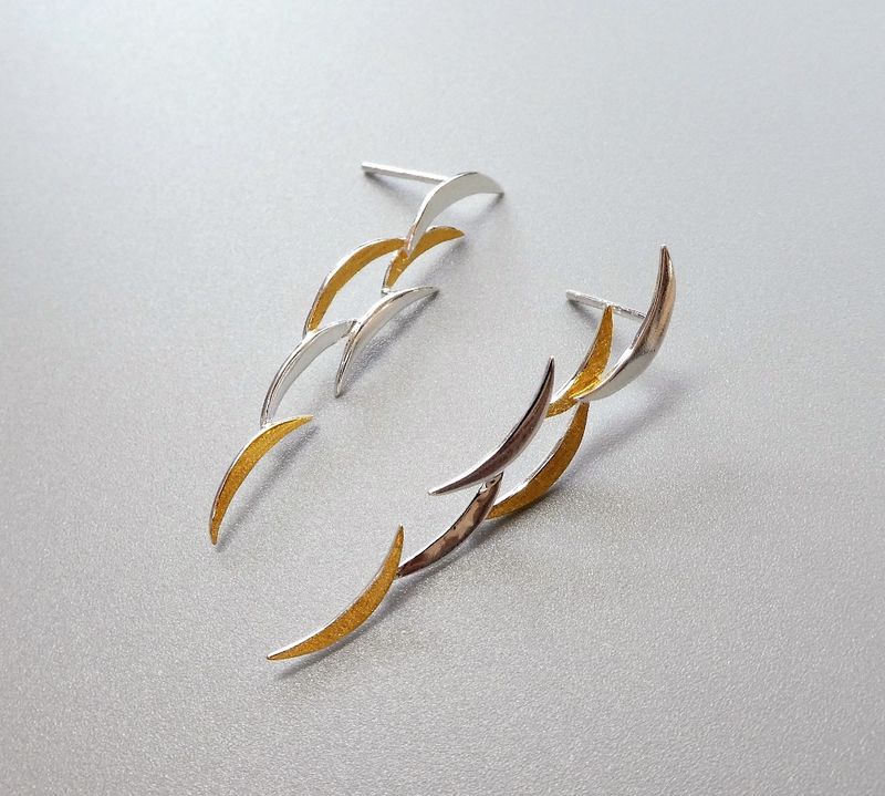 Sterling silver eclipse moon cluster earrings in gold and silver two tone. The moon surface alternates from shiny to sand cast texture. Modern sculptural design with exquisite details. Unique and chic. Perfect for your sophisticated look!