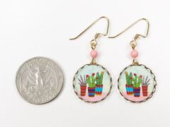 Three pots of blooming cactus print on round brass background with lovely lace edge, accented with a light pink bead. 14K gold filled hook. Cute and unique design. Light weight, durable and comfortable. Great for everyday wear!