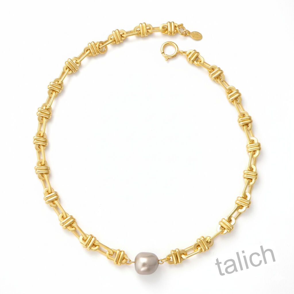 Catherine Popesco chunky gold chain link necklace with large gray Swarovski Baroque pearl in center. Chic and elegant. Just the perfect touch to your sophisticated outfit!