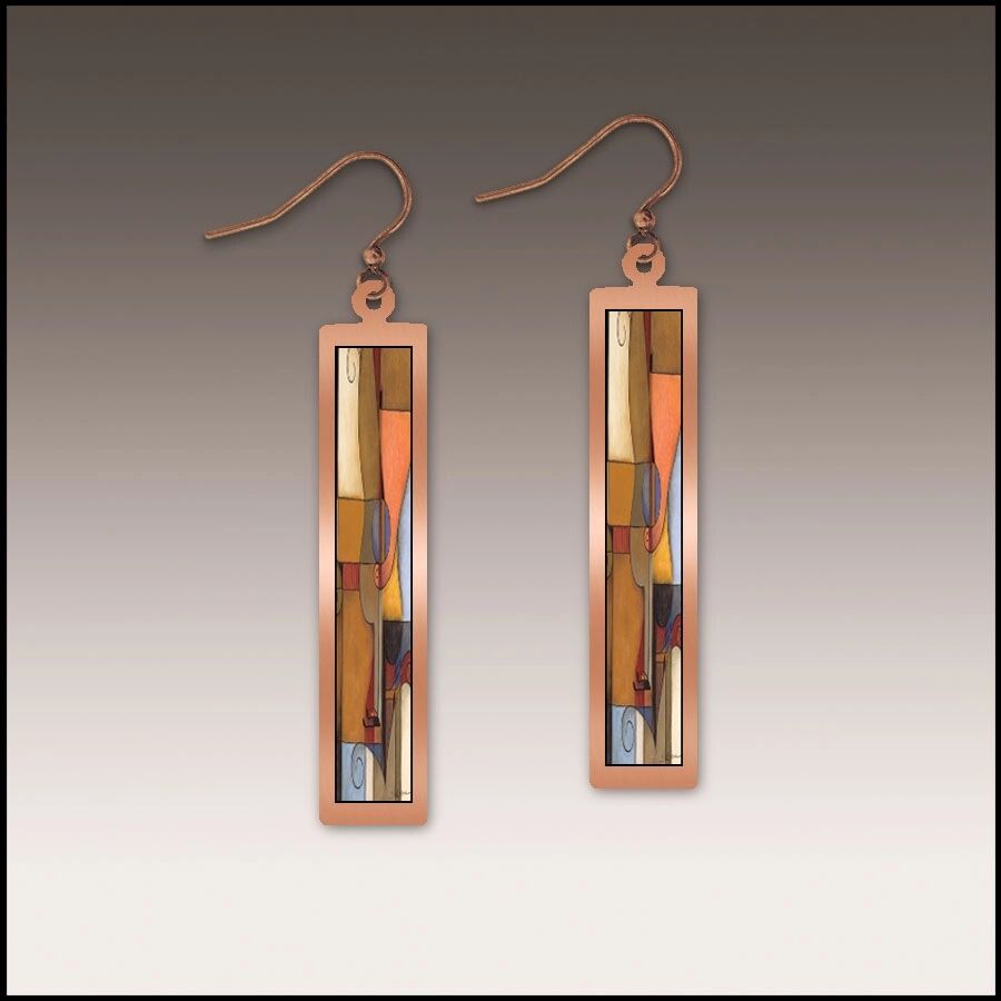 DC Designs earrings are truly wearable art! Linear long column drop earrings feature abstract fine art print in sleek copper frame. Warm earthy color palette showcases a soft blend of brown, orange, and a subtle dab of blue, all with a beautiful satin texture. Light weight and water resistant. These modern earrings are sure to add touch of color and artful style to your outfit!